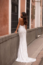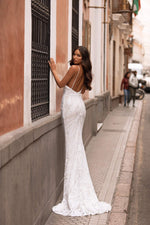 Glamorous & beautiful, the Lilana Gown is made from shimmering white patterned sequins fabric on top of ivory lining. This gown features a daring & modern plunge neckline with an open back & mermaid train.