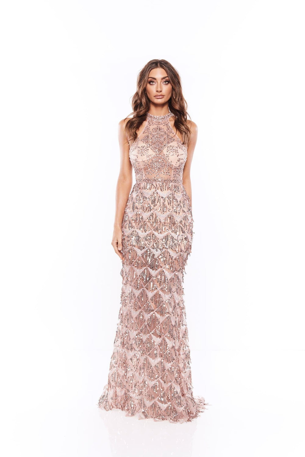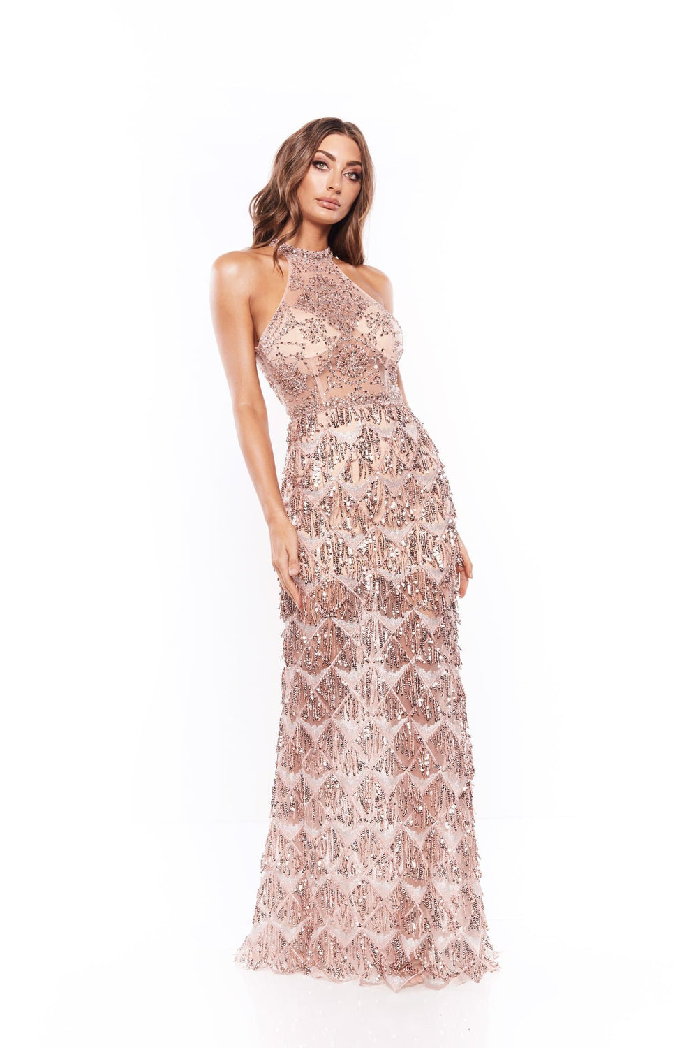 Stunning beaded and tassel gown in rose gold. Top part is hand beaded with beautiful floral pattern. Bottom part is made from tassel glistening sequins so you can shine all night. This stunning gown features an open back for that extravagant look.