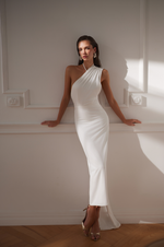 Invest in a timeless style that provides both sophistication and class. The Sofia Midi Dress is designed with a high single shoulder neckline that is wrapped around the neck and draped down the back, a fitted skirt that hugs the hips and sits at a midi length. Cut from a luxurious matte satin fabric in a soft white tone. Reinvented for the modern woman, the Sofia Midi Dress is the epitome of luxury.