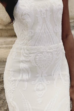 Exuding glamour and style, the Zerlina Gown embodies the most coveted elements of elegance. Distinguished by a graceful scooped neckline, a sensuous side slit, and a patterned sequin fabric, it redefines sophistication. Completing the allure is a lace-up back, ensuring that you will captivate every gaze at your special event.